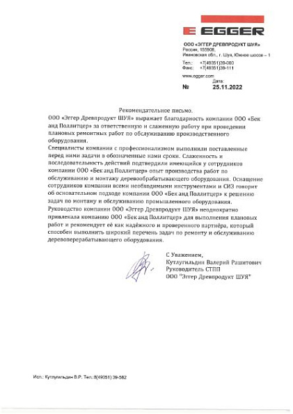 За высокий результат выполненных работ точно в срок, Заказчик отметил наших специалистов благодарственным Письмом.